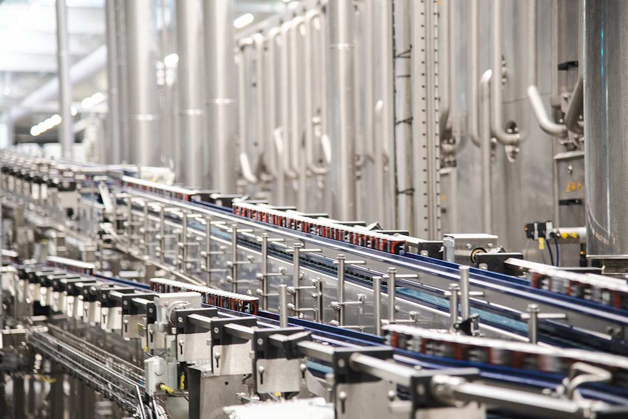 To put it simply, a classic canning line looks like this: Its individual machines – filler, pasteuriser, packer, etc. – are interconnected by means of wide bulk conveyors, on which the cans jostle several lanes deep. Bulk conveyors form the basis for operating the entire line. Most of the time, the containers are spaced out as they travel along the conveyor belt, and at one point or another buffering sections are integrated. In this way, the conveyor serves to ensure an even container distribution if there is a stoppage in the line. Each machine possesses its own control system. Back-up switches at the conveyor emit a signal that informs this control system if the belt leading to the next machine is filling up and the machine must be stopped.