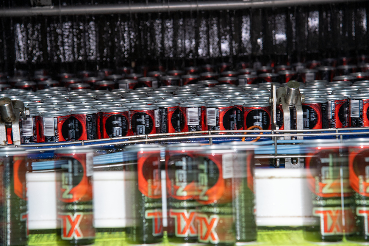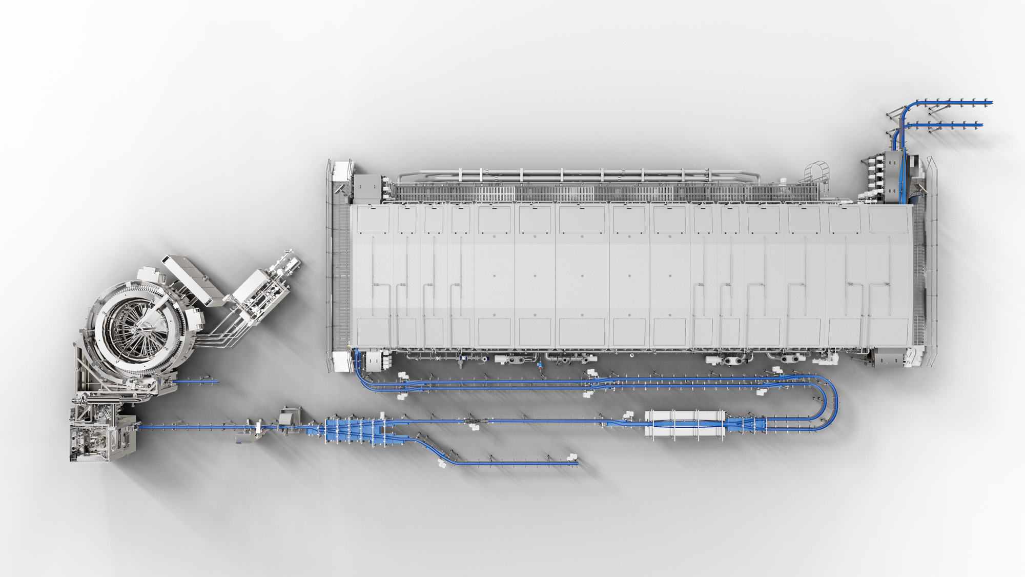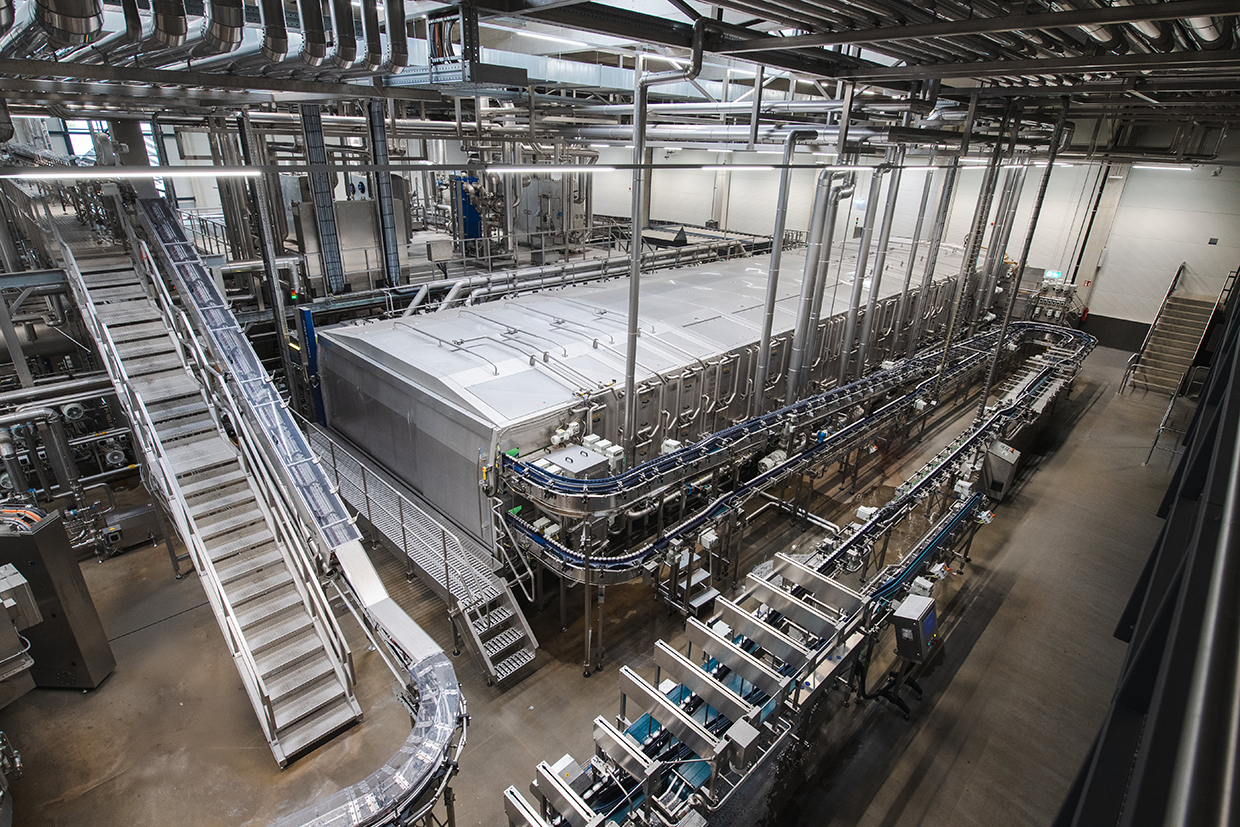 The line layout with the new LinaFlex eSync presents an entirely different picture: The cans race along a narrow, single-lane conveyor in a close-packed flow on a comparatively short bend from the filler to the pasteuriser and from there to the packer. The conveyor does not include a single buffer section. On the contrary: The belts are always completely filled, and the number of cans between the individual machines is kept constant.