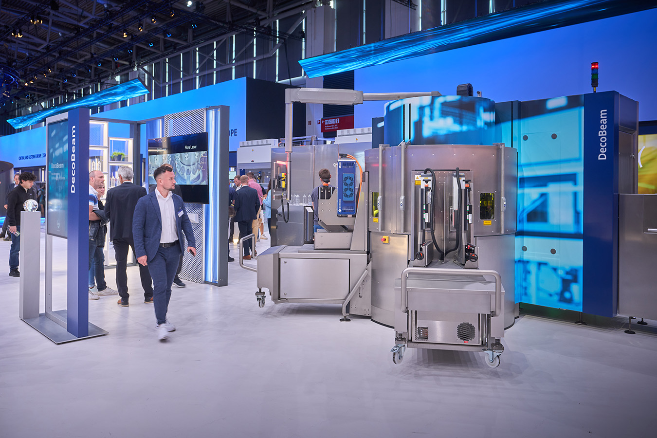 Although they may seem tiny among the massive machines in our exhibition hall, many visitors can’t take their eyes off the bottles on display in our decoration technology area. They are picking them up, turning them over in their hands and running their fingers over the surfaces, comparing the different bottles. What’s got them so enthralled? These containers bear no traditional labels – and yet they have everything that beverage packaging needs. Thanks to two innovations from Krones’ decoration technology team: DecoBeam and INKpression.